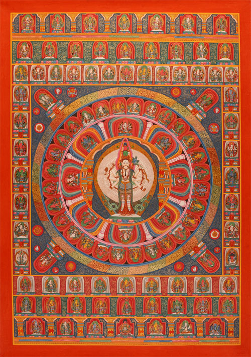 Sahasrabhuja Lokeshvara, painted in the traditional style using real gold.