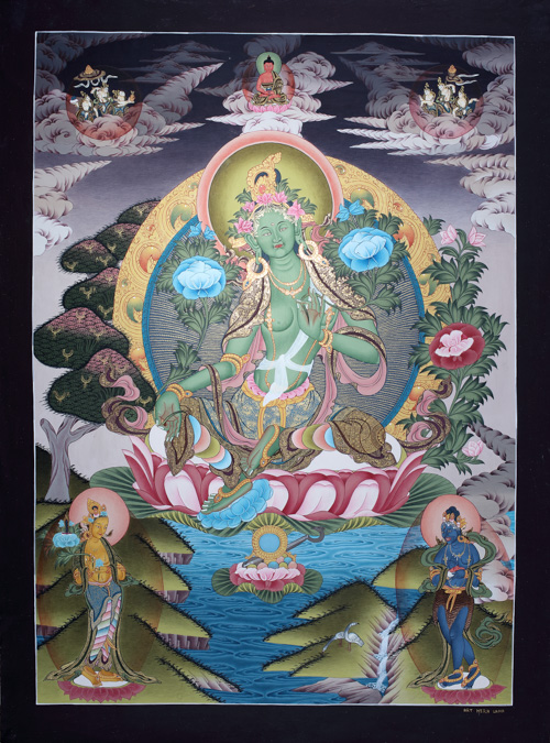 Ein prachtvoll gemalter Grüne Tara-Thangka in sehr schönen Farben. Über der Shyamatara sind himmlische Wesen zu sehen.