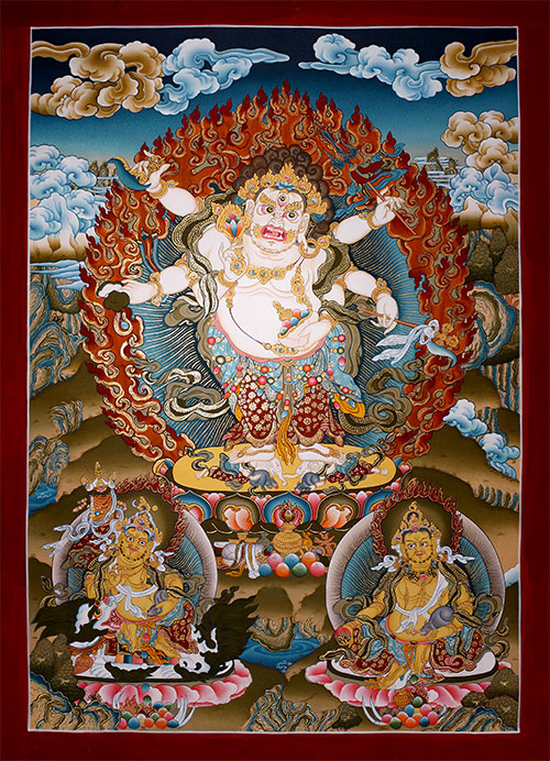 A Beautiful thangka of White Mahakala (Gonpo Nagpo). Shad Bhuja Sita is the wealth aspect of Mahakala. Very lovingly painted with a lot of gold