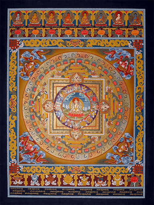 Mandala Thangka der Weißen Tara. Sitatara erscheint im Zentrum eines wunderschönen Mandalas. Der gesamte Thangka wurde sehr fein und zugleich sehr aufwändig unter Verwendung vielen Goldes gemalt.