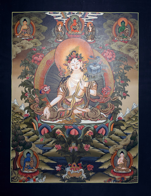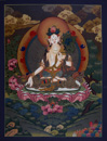 A stunningly beautiful White Tara Thangka. The Sitatara was painted on this Thanka in beautiful colors with the use of real gold.