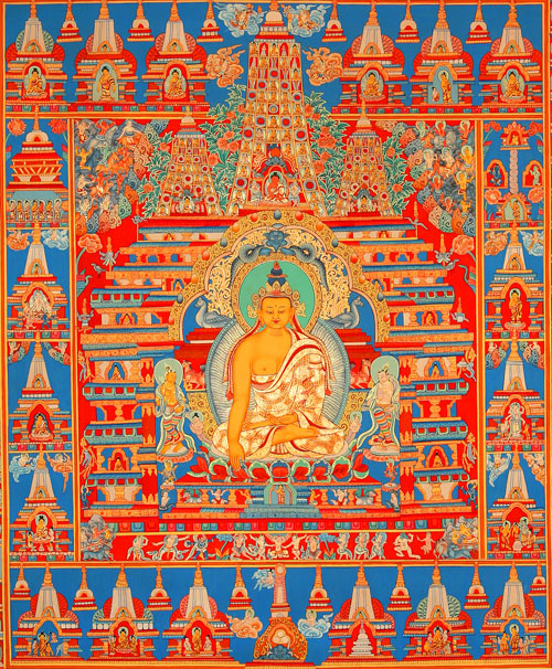 "Das Zentrum des farbenprächtigen Bildes wird beherrscht von Buddha Shakyamuni auf dem Vajra-Thron vor dem Tempel zu Bodh Gaya, dem heiligsten Ort in der buddhistischen Welt, wo er unter dem Bodhi-Baum die Buddhaschaft erlangte. Eingerahmt wird das zentrale Feld von zahlreichen Stupas und Episoden aus dem Leben des Buddha. Außerdem befinden sich auf diesem Rollbild verschiedene Gottheiten des tantrischen Buddhismus, die den Buddha Shakyamuni als Lehrer der Sutra- und Tantra-Tradition ausweisen und möglicherweise auch ein Hinweis auf seine Verkündung des Kalachakra-Tantra im Dhanyakataka-Stupa in Südindien sind (Kulturstiftung Ruhr, Essen, Ausstellungskatalog, München 2006)."